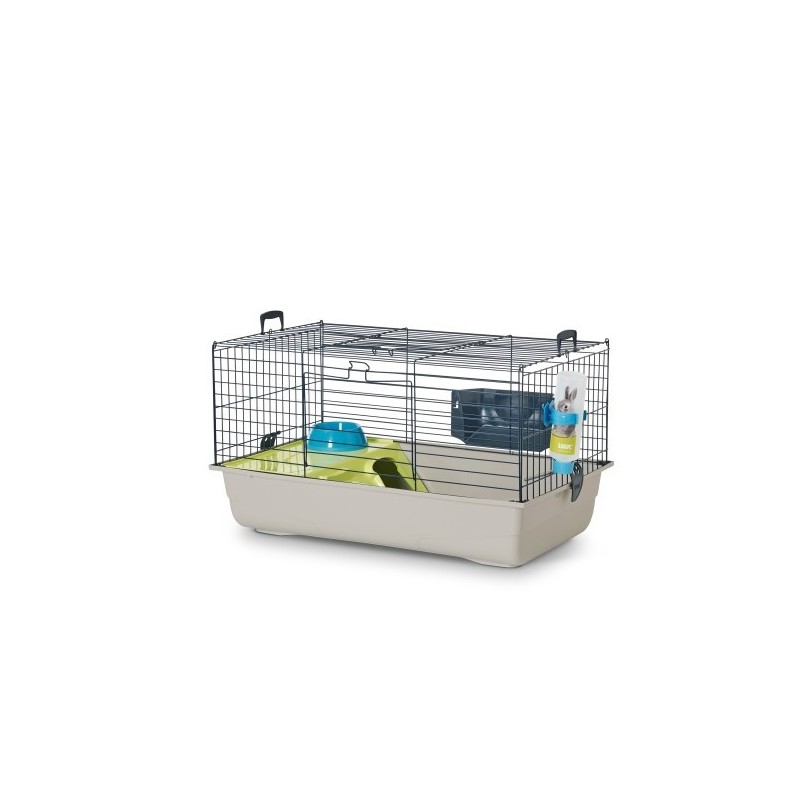 Nero 2 De Luxe gray rabbit and guinea pig cage. Includes a bottle, shelter, water bowl, and feeder. Measures 80 cm.