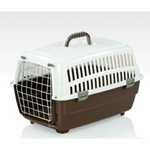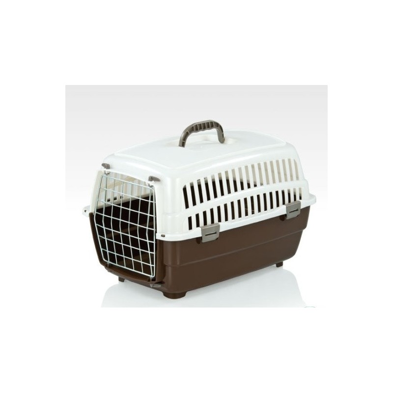 The Voyager carrier is a transport item for dogs and cats. It is brown and white, has a metal door, a removable top, and measures 48 x 32 x 31 cm.