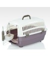 The Voyager Small Lux carrier is a transport item for birds and rodents. It is gray and white, with a metal door, a food/water bowl, and a removable top. Its dimensions are 48 x 32 x 31 cm.