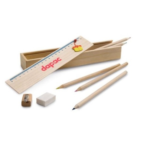 Set de dibujo en madera promocional con logo DAPAC. A descatalogar cuando se agoten existencias.