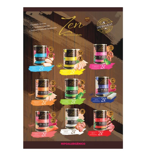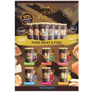 Hoja de venta Zen pouches Meat Lovers - Zen paté. Gama completa de alimentación húmeda de Zen Natural Balanced Nutrition. Incluye PVPs.