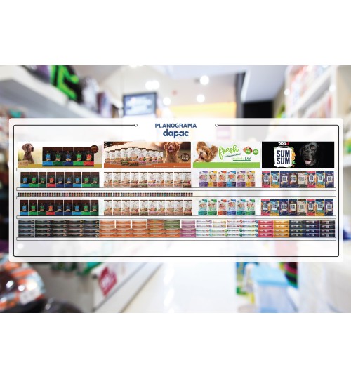 Planograma para gama completa de alimentación seca DAPAC. De izquierda a derecha: Zen Grain Free - Zen Low Grain - Fresh mediterranean Blend - DOG#1 SumSum. Guía para tiendas propias y distribución.