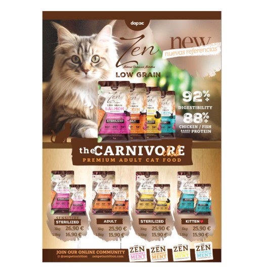 Hoja de venta NUEVA gama Zen Cat Low Grain: Chicken Adult, Sensitive Sterilized Salmon, Chicken Sterilized y Kitten.