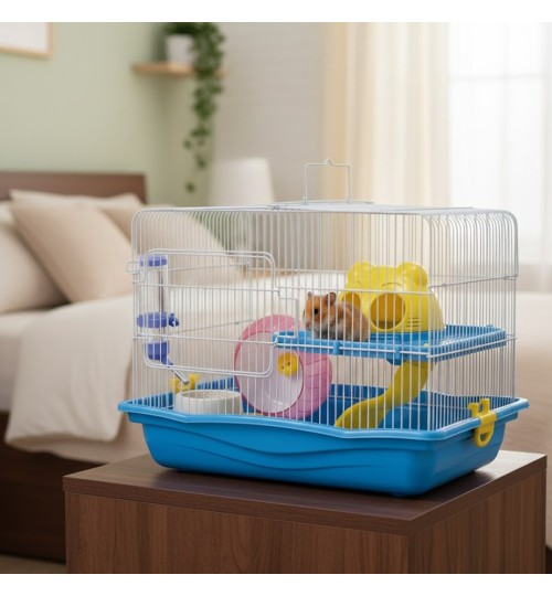 Jaula para hamsters,roedores y jerbos Medidas: 45x30x32 cm. Diseño en color azul y amarillo