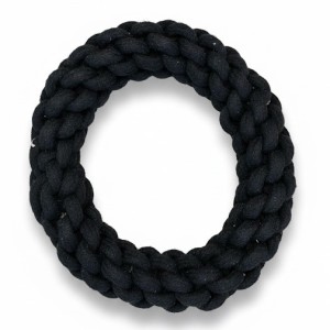 Anillo de cuerda trenzada (fibra natural) para tirar, morder y recoger. Nudos compactos, sensación amable con dientes y encías, apto para mordida fuerte con uso supervisado. Color negro. Diametro 20 cm.