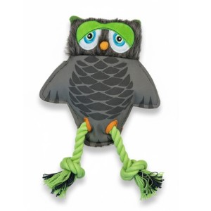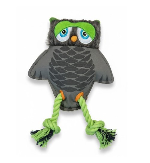 Búho de peluche + cuerdas para tirar, morder y sacudir. Textil suave con costuras de refuerzo y patas de cuerda con borlas.