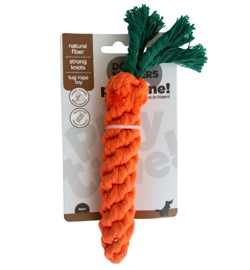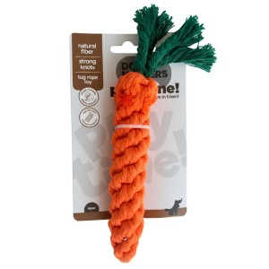 Juguete con forma de zanahoria hecho en fibra natural con nudos resistentes. Perfecto para morder, lanzar y jugar al tira y afloja; ayuda a la...