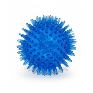 Peluota erizo de TPR para perro, con púas blandas que mejoran el agarre y aportan masaje suave en encías; ideal para fetch & catch y estimulación sensorial en perros pequeños-medianos. Color azul translúcido