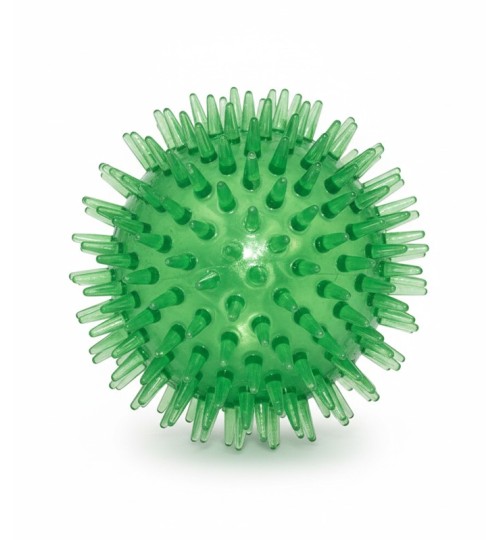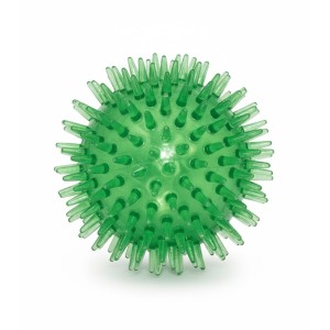 Pelota erizo de TPR para perro, con púas blandas que mejoran el agarre y aportan masaje suave en encías; ideal para lanzar y estimulación sensorial en perros pequeños-medianos. Color verde translúcido.