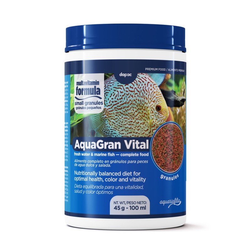 AquaGran Vital de Dapac es un alimento completo en gránulos pequeños para peces ornamentales de agua dulce y salada, especialmente adecuado para cíclidos. Su fórmula multivitamínica proporciona una dieta equilibrada que promueve vitalidad y energía, salud óptima y color natural y brillante.