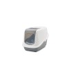 Arenero cubierto Nestor blanco cool grey. Apertura de par en par para retirar la arena sin quitar la tapa superior. Trasera elevada para evitar fugas. Tirador, asa de transporte. Puerta abatible y filtro de carbón activo. Dimensiones: 56x39x38.5 cm.