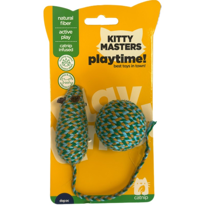 El ratón con pelota es un juguete para gatos perteneciente a la colección Time to Play de Kitty Masters. Es un accesorio fabricado en sisal, seguro y resistente. Los ratones son de tonalidades verdes y sus dimensiones son 45x38x20 cm