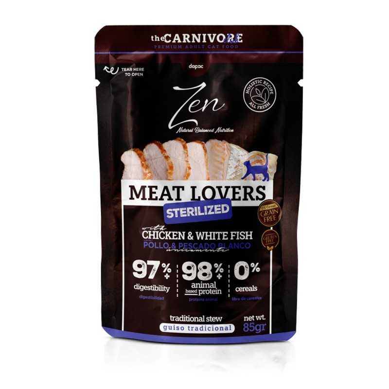 Comida húmeda completa para gatos esterilizados, pavo y pescado blanco. 97% proteína animal, sin cereales ni gluten. Con taurina y L-carnitina.