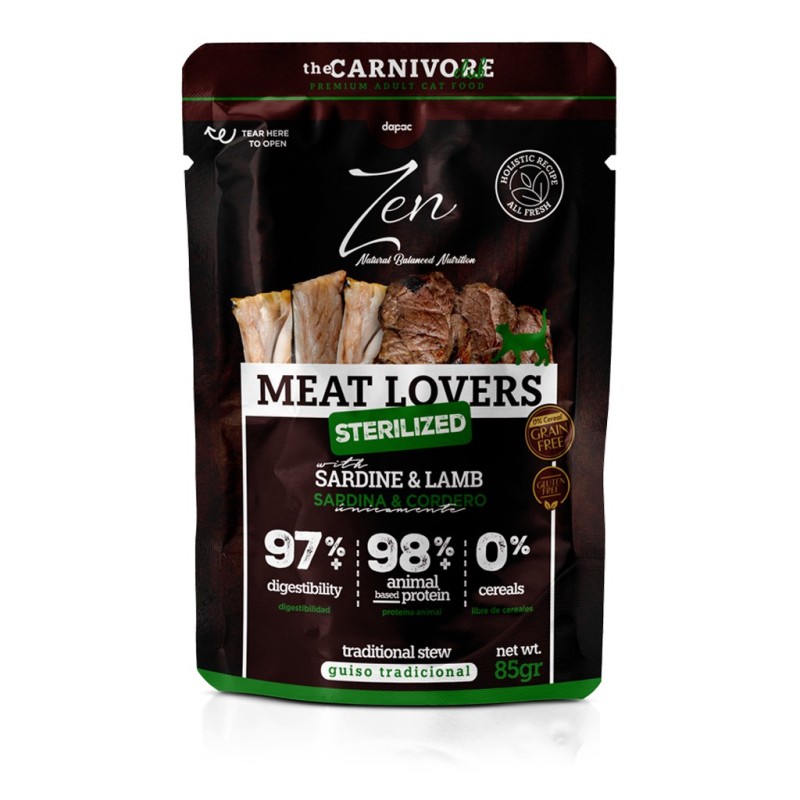 Comida húmeda completa para gatos esterilizados, con pavo, sardina y atún frescos. 97% proteína animal; sin cereales ni gluten. Con taurina, vitaminas C y E y L-carnitina.