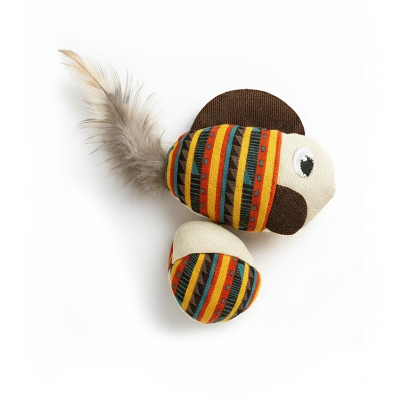 Juguete ligero de caza indoor con forma de pez y pelota a juego. Fácil de patear, perseguir y transportar. El pez lleva catnip en el interior para incentivar el juego y una cola de plumas que multiplica el interés. Pensado para sesiones de juego activo con textura suave y agarre cómodo.