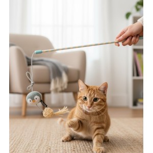 Caña teaser de 45 cm con pingüino de peluche para gato. Aromatizada con catnip + silvervine para máxima atracción. Fomenta el ejercicio y el vínculo en sesiones de caza controlada.