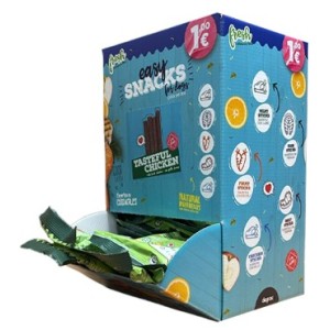 Easy snacks Tasteful chicken. Barritas de pollo para perros. Elaboradas en proceso de cocción lenta para mantener el sabor y nutrientes de cada ingrediente. Bajo en cereales. Peso: 100 g. Recomendamos pedir en múltiplos de 150 unidades para que vaya con caja protectora.