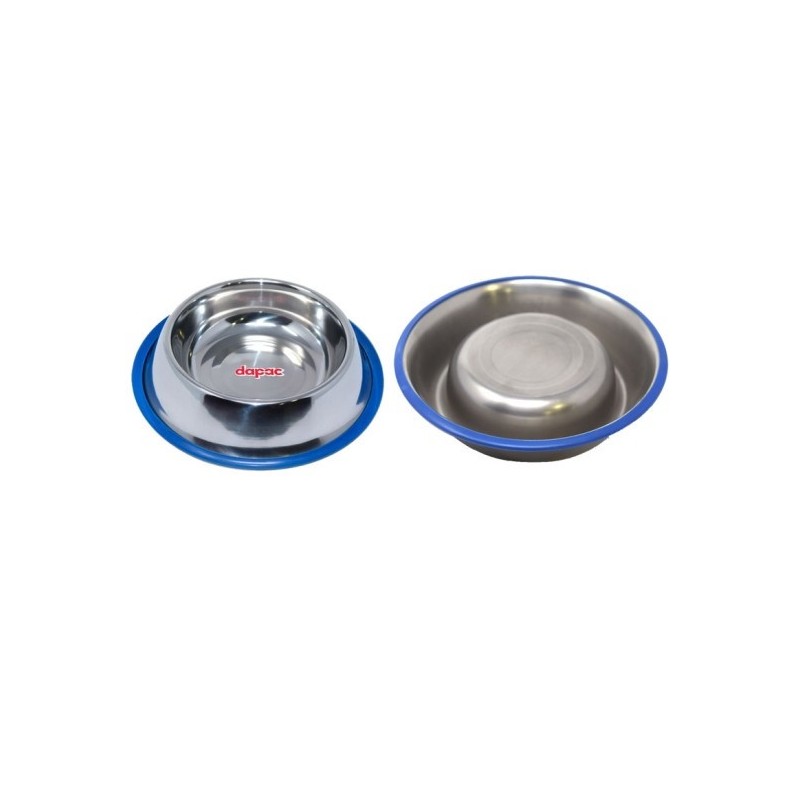 Este comedero en acero inoxidable cuenta con base antideslizante y lleva un borde inferior de silicona en color azul. Cuenta con un diámetro de 22 cm.