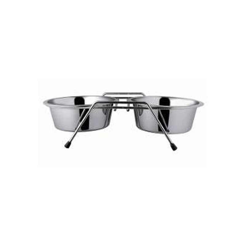 Doble comedero en acero inoxidable con soporte incluido. Diámetro: 13 cm.