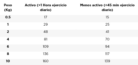 | Peso (kg) | Activo (>1h ejercicio) | Menos activo (<45 min>) |