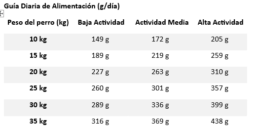 Para un mantenimiento óptimo, divida la ración de alimento seco en 2 o 3 tomas al día. Las cantidades son orientativas según la actividad del perro: