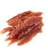 Tiras de pechuga de pato para perros, elaboradas con ingredientes naturales y 100% proteína animal. Sin azúcares, sin OGM, sin hormonas ni antibióticos, y libres de colorantes y conservantes artificiales. Sin gluten. Perfectas como premio, recompensa o para adiestramiento.