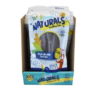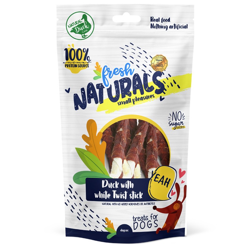 Snacks palitos de pato para perros duck white twist stick Fresh Naturals. Elaborado con ingredientes naturales. 100% proteína de origen animal. Sin colorantes ni conservantes artificiales. Sin hormonas ni antibióticos. Sin azúcares añadidos. Libre de gluten. Bolsa zip para una mejor conservación. Formato bolsa: 100 g.