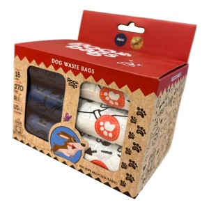 Poo bags azules y blancas reciclables higiénicas 18 rollos x 15 unidades.