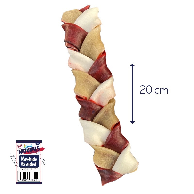 Snack para perros trenza de piel de vacuno Fresh Naturals. Medida: 20 cm. Elaborado con 100% proteína de origen animal. Sin hormonas ni antibióticos. Sin azúcares añadidos. Libre de gluten. Ingredientes: cuero natural de res.