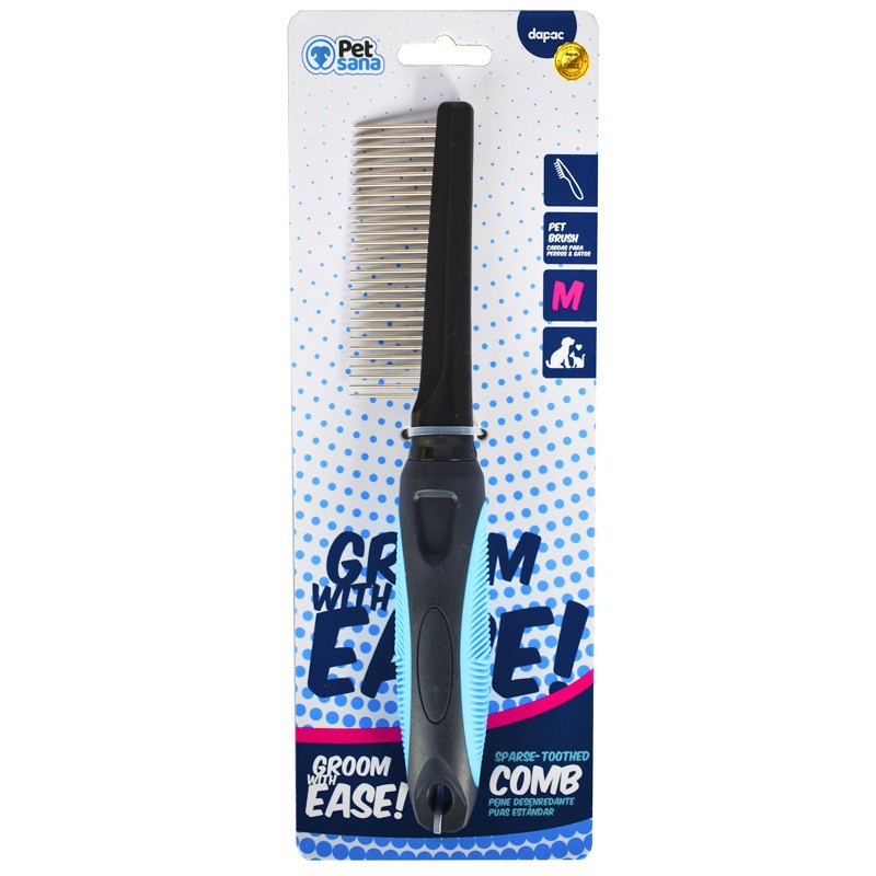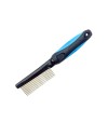 Peine  desenredante de púa estándar para perros y gatos. Puntas redondeadas para no dañar la piel de la mascota. Mango antideslizante y ergonómico de color azul.