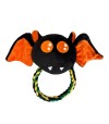 Murciélago Aro Tirador Naranja es un juguete de peluche diseñado para perros, parte de la colección Playtime de Doggy Masters. Este simpático murciélago destaca por su suave cuerpo negro con alas naranjas y un aro de cuerda trenzado en tonos verde, negro y amarillo que invita al juego. Sus grandes ojos y colmillitos bordados le dan un toque divertido y seguro para tu peludo.