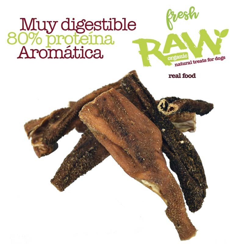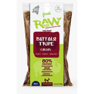 Fresh Raw tripa de búfalo horneado. Perfectos para mantener una buena salud bucodental. 80% proteína. Crujiente (muy sensorial para los perretes). Formato 100gr. La bolsa contiene 4 unidades (aprox). También disponible en 800gr.