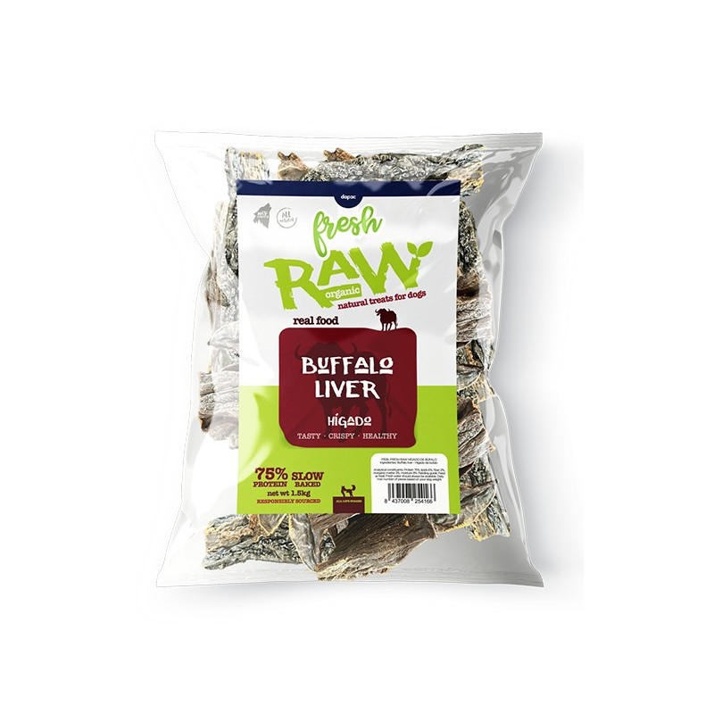 Fresh Raw hígado. Hígado de búfalo. 75% proteína. Perfectos para mantener una buena salud bucodental. Crujiente (muy sensorial para los perretes). También disponible en 100gr. La bolsa contiene 55 unidades (aprox). Formato 1,5kg. Medida 10cm aprox