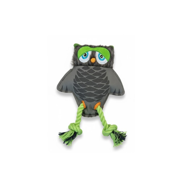 Este búho combina peluche sensorial y cuerdas de tracción para que tu perro pueda tirar, morder y sacudir con seguridad. El cuerpo textil gris lleva costuras de refuerzo y borde de faux fur; la cabeza luce antifaz verde, ojos bordados/estampados y pico naranja. Las dos patas de cuerda terminan en borlas para un agarre cómodo.