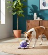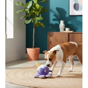 Peluche de textura muy suave con forma de pulpo y un cono rígido en la cabeza que añade un plus de juego (2-en-1). Incorpora sonido interior al presionar y patas crujientes para mantener la atención del perro. Medidas aprox.: 20,3 × 20,3 × 11 cm.