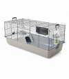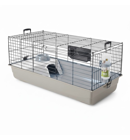 Savic Nero 3 De Luxe — jaula interior amplia para conejos y roedores grandes (100 × 50 × 45 cm). Incluye plataforma con zona de descanso inferior, comedero, henera y botella de 500 ml. Limpieza fácil con base extraíble y dos puertas (frontal y superior) para acceso cómodo. Separación de barrotes 25,6 mm. Rejilla plateada y base de diseño moderno.